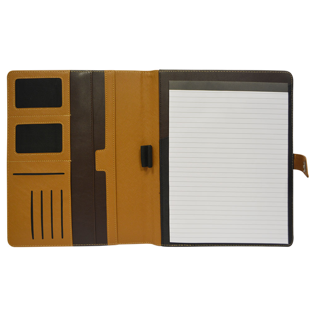 Konferenční desky s uzavíráním na poutko s drukem, blok linkovaný A4, přihrádky na dokumenty a vizitky, 2xpoutko na tužku. Hřbet 10mm. Materiál PU tmavá/světlá hnědá barva.