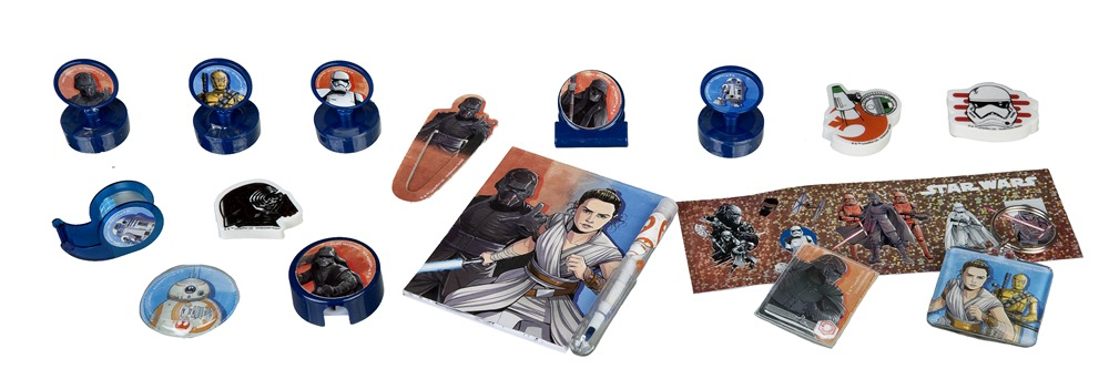 1 ořezávátko, 3 guma, 2 mini puzzle, 6 mini razítek, 1 poznámkový blok, 3 laserové nálepky, 1 mini vyskakovací pastelka, 1 mini vyskakovací tužka, 1 sponka na papír, 2 samolepka, 1 kroužek na klíče, 1 lepící páska , 1 záložka.