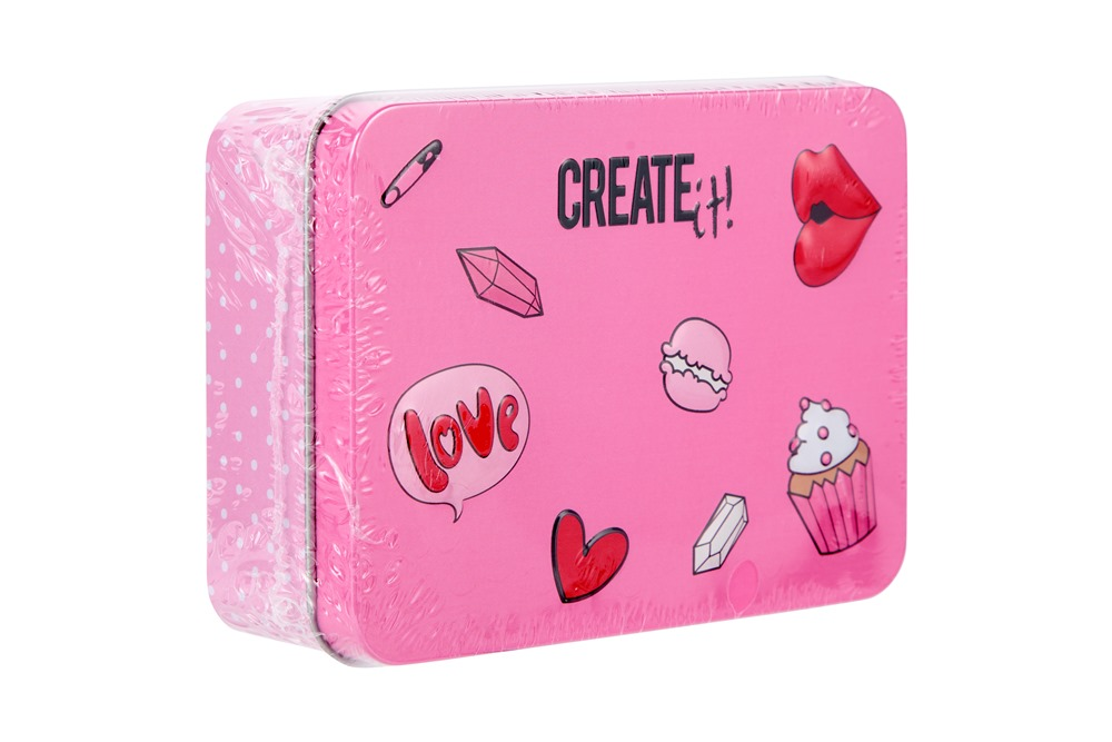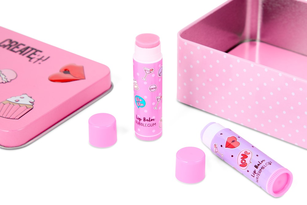 Sladká sada balzámů na rty Create it! v roztomilé růžové plechové dóze s puntíky se stane tvým každodenním společníkem. Díky pěti různým balzámům máš připravený jeden na každý školní den, a pokud se chceš podělit, můžeš některý věnovat i svým kamarádkám.Plechová dóza navíc nabízí dostatek místa i pro další kosmetiku, takže si do ní můžeš uložit i jiné své oblíbené kousky. V sadě najdeš pět různých příchutí - růžový balzám s vůní třešně, fialový s borůvkou, světle růžový s jahodou, žlutý s jablkem a zelený s hroznem. Každý den tak můžeš vyzkoušet jinou chuť a barvu a tvé rty budou vždy krásně hydratované a voňavé.Produkty Create it! jsou dermatologicky testované, bez parabenů a nejsou testované na zvířatech, takže jsou bezpečné a vhodné pro dívky ve věku 6–14 let. Obal je vyroben z recyklovatelného PET a FSC certifikovaného papíru a hravý design podporuje kreativitu a radost z péče o sebe.