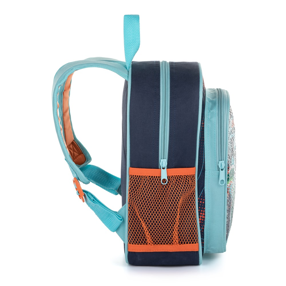 Menší batůžek vhodný pro děti předškolního věku na volnočasové aktivity. Má jednu velkou kapsu, menší kapsu na svačinu a postranní kapsičky na lahev na pití. Ideální pro děti od 3 do 6 let.