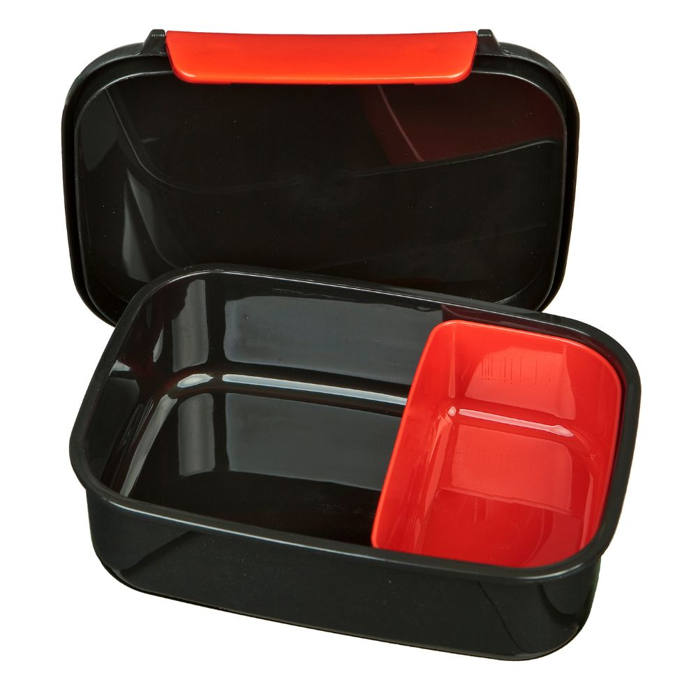 Plastová krabička na svačinu s motivem Spider-Man, uvnitř s rozdělovací přepážkou. Box není vhodný do myčky ani mikrovlnné trouby.
