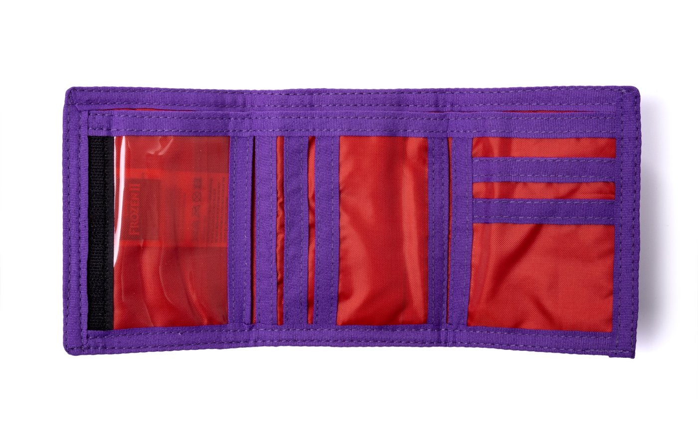 Praktická textilní peněženka na suchý zip. Vzadu je uzavíratelná kapsička na drobné, uvnitř jedna přihrádka na bankovky, šest kapsiček na karty a jedna průhledná kapsa.