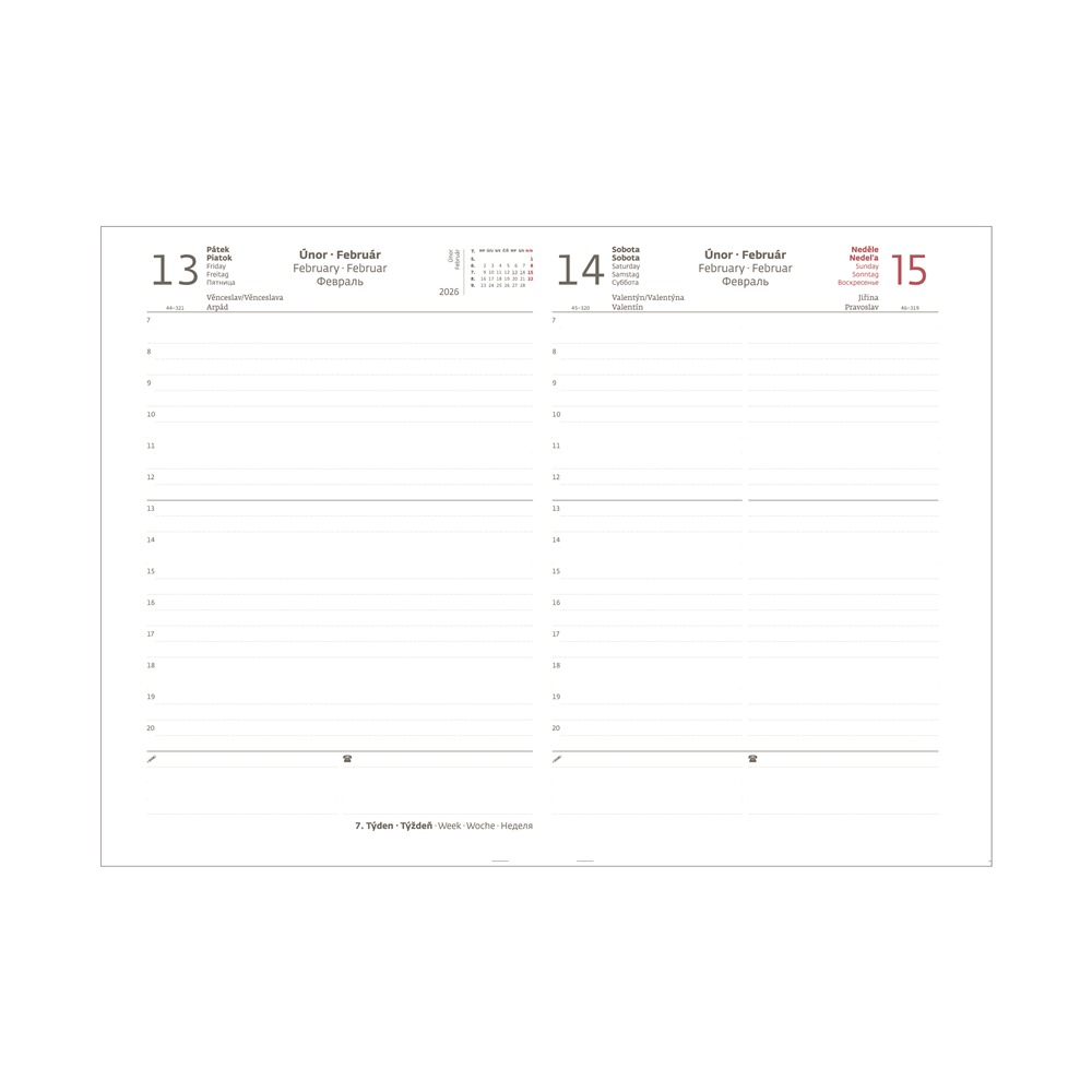 Diář A5 s denním rozvrhem z kolekce VERDE obsahuje 352 stran a je ideální pro ty, kdo vyžadují podrobné denní plánování. Povrchová úprava Soft touch lamino mat s UV lakem zajišťuje diáři nejen elegantní vzhled, ale i odolnost proti opotřebení. Diář obsahuje mnoho praktických informačních stránek: osobní údaje, plánovací kalendář pro rok 2026, přehledný kalendář pro roky 2026/2027, seznam křestních jmen a mezinárodních svátků, mezinárodní telefonní předvolby a důležitá telefonní čísla, prostor pro poznámky a plánovač dovolené. Kalendárium zahrnuje jména a státní svátky v češtině a slovenštině, dny a měsíce v pěti jazycích (čeština, slovenština, němčina, angličtina, ruština), počet dnů od začátku do konce roku, měsíční fáze a mapy České republiky, Slovenska a Evropské unie. Další vlastnosti jako kulaté rohy a perforace pro snadné odtrhávání stránek zvyšují uživatelský komfort a funkčnost diáře.