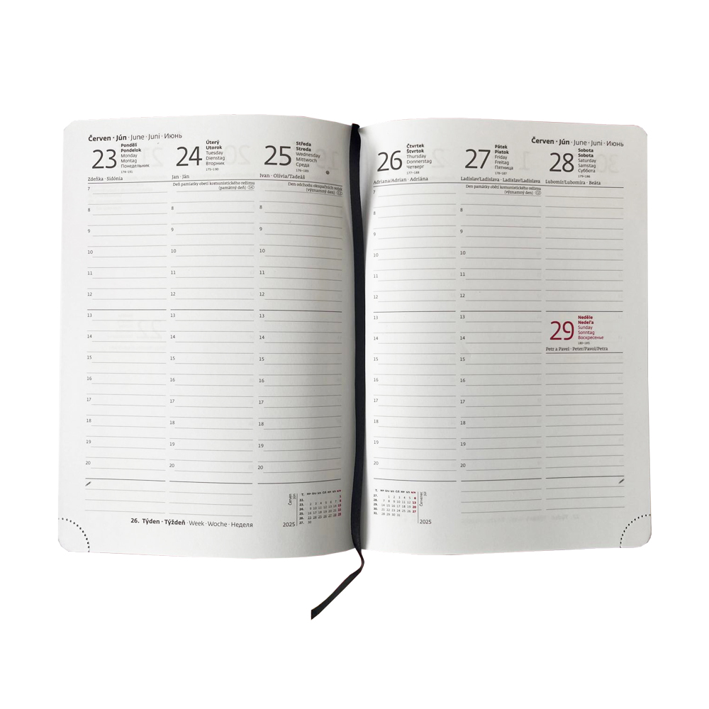 Diář A5 týdenní z kolekce PASTELINiObjevte elegantní diář ve formátu 143 x 205 x 12 mm a s 128 stranami, provedený v oblíbených pastelových barvách z kolekce PASTELINi. Moderní vzhled dotváří povrchová úprava Soft touch lamino s UV lakem. Diář je vybaven sekcí pro osobní údaje, plánovací kalendář na rok 2025, přehledný kalendář na roky 2025/2026, seznam svátků, mezinárodní telefonní předvolby, a také prostor pro vaše poznámky a plánovač dovolené. Kalendárium nabízí jména a státní svátky v češtině a slovenštině, dny a měsíce v pěti jazycích (čeština, slovenština, němčina, angličtina, ruština), počet dnů od začátku do konce roku, měsíční fáze a také mapy České republiky, Slovenska a Evropské unie. Design je doplněn kulatými rohy a perforací pro snadné odtrhávání stránek. Tento diář je ideální pro každodenní organizaci a plánování jak v profesním, tak v osobním životě, spojující funkčnost s estetikou.