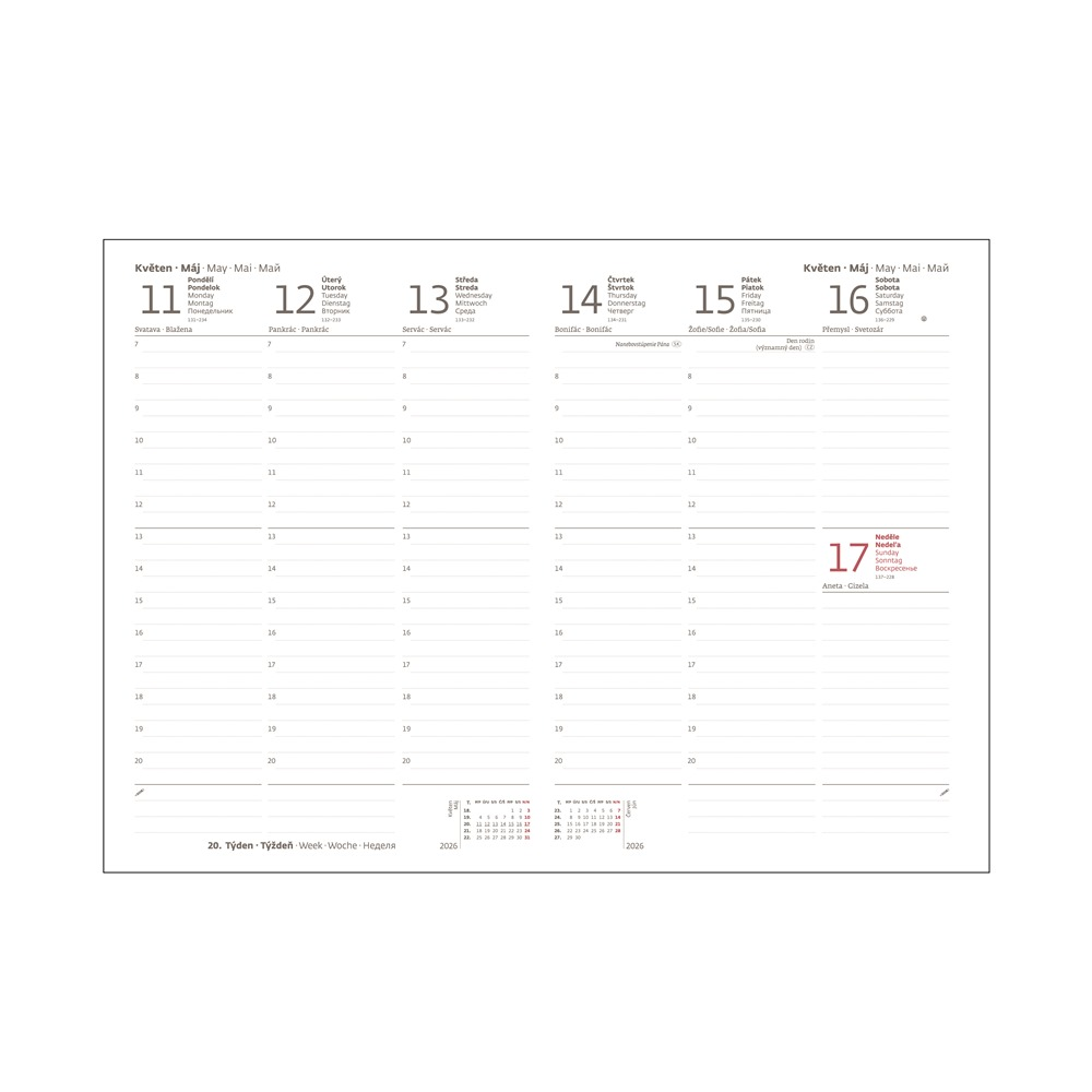 Diář A5 týdenní z kolekce PASTELINi. Objevte praktický diář s 128 stranami, provedený v oblíbených pastelových barvách z kolekce PASTELINi. Moderní vzhled dotváří povrchová úprava Soft touch lamino s UV lakem. Diář je vybaven sekcí pro osobní údaje, plánovacím kalendářem na rok 2026, přehledným kalendářem na roky 2026/2027, seznam svátků, mezinárodní telefonní předvolby, a také prostor pro vaše poznámky a plánovač dovolené. Kalendárium nabízí jména a státní svátky v češtině a slovenštině, dny a měsíce v pěti jazycích (čeština, slovenština, němčina, angličtina, ruština), počet dnů od začátku do konce roku, měsíční fáze. Design je doplněn kulatými rohy a perforací pro snadné odtrhávání stránek. Tento diář je ideální pro každodenní organizaci a plánování jak v profesním, tak v osobním životě, spojující funkčnost s estetikou.