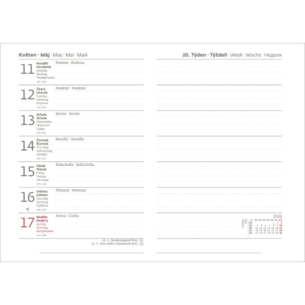 Objevte praktický týdenní diář ve formátu A6 s 128 stranami, provedený v oblíbených pastelových barvách z kolekce PASTELINi. Moderní vzhled podtrhuje povrchová úprava Soft touch lamino s UV lakem. Diář obsahuje prostor na osobní údaje, plánovací kalendář na rok 2026, přehledný kalendář na roky 2026/2027, seznam křestních jmen, důležitá telefonní čísla a přehledný měsíční kalendář na období 2026/2027. Nechybí ani prostor na poznámky. Kalendárium zahrnuje jména a státní svátky v češtině a slovenštině, dny a měsíce v pěti jazycích (čeština, slovenština, němčina, angličtina, ruština), počet dnů od začátku do konce roku a měsíční fáze. Praktický design doplňují kulaté rohy a perforace pro snadné odtrhávání stránek. Tento diář je ideální pro každodenní organizaci a plánování, spojuje funkčnost s estetikou v kompaktním formátu.