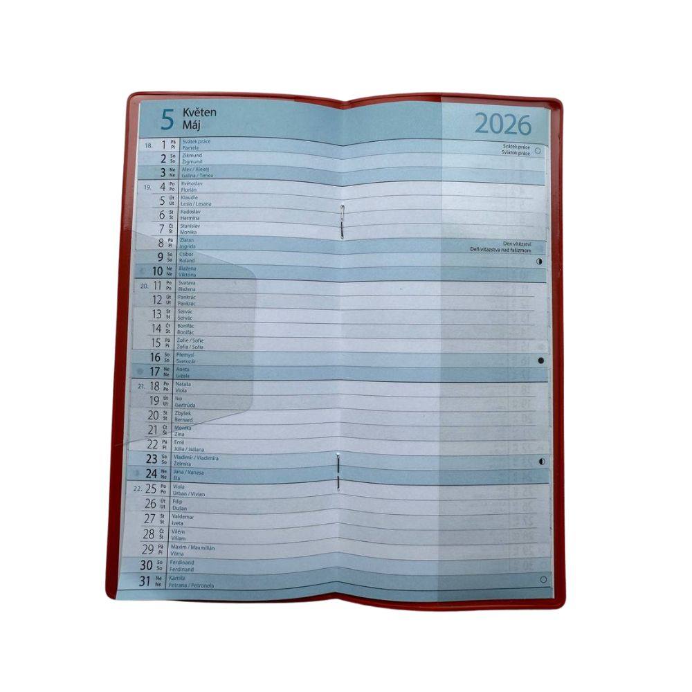 Kompaktní měsíční diář v odolném PVC obalu, ideální do tašky či kabelky. Obsahuje 32 stran s měsíčním kalendáriem od prosince 2025 do ledna 2027. Nabízí dopolední a odpolední hodinové plánování, čísla týdnů, přehled českých křestních jmen a státních svátků. Praktický nástroj pro efektivní organizaci času.