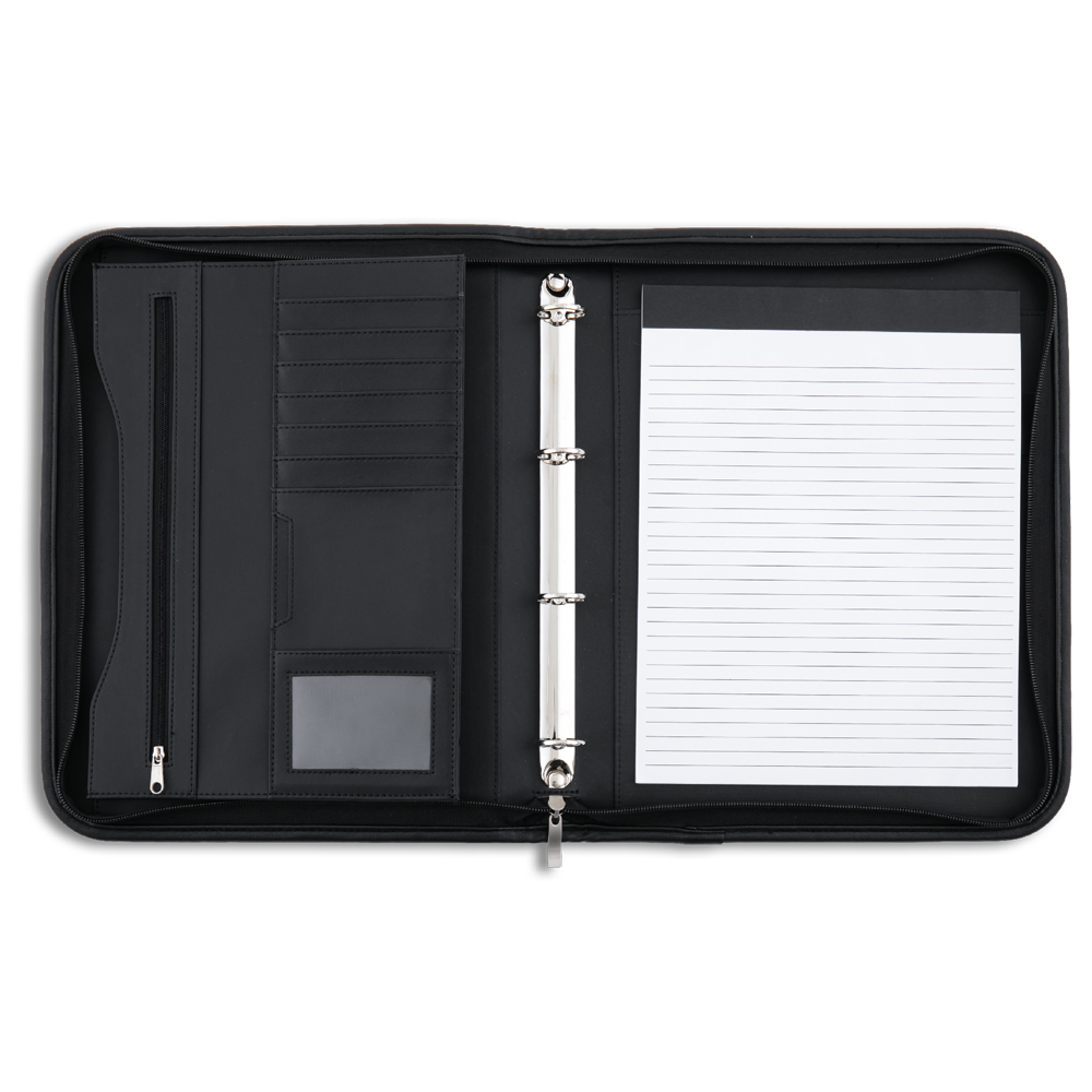 Konferenční desky uzavíratelné na zip, 4kr.mechanika R25, blok linkovaný A4, přihrádky na dokumenty a vizitky. Hřbet 40mm, ucho pro přenášení. Materiál PU matná, černá barva.