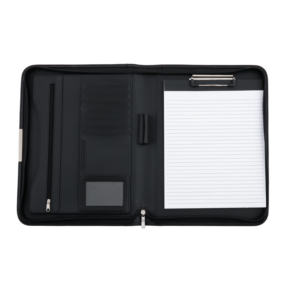 Konferenční desky uzavíratelné na zip. Uvnitř blok linkovaný A4 s klipem, přihrádky na dokumenty a vizitky, poutko na tužku. Hřbet 30mm. Materiál PU matná, černá barva.