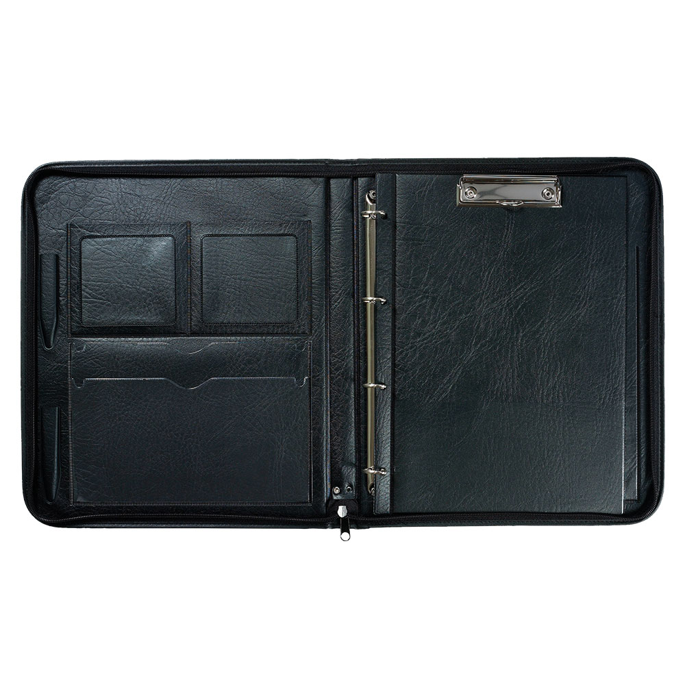 Uzavíratelná na zip, uvnitř kapsy na dokumenty a vizitky, úchytky na psací potřeby, 4kroužková mechanika, jednodeska s klipem