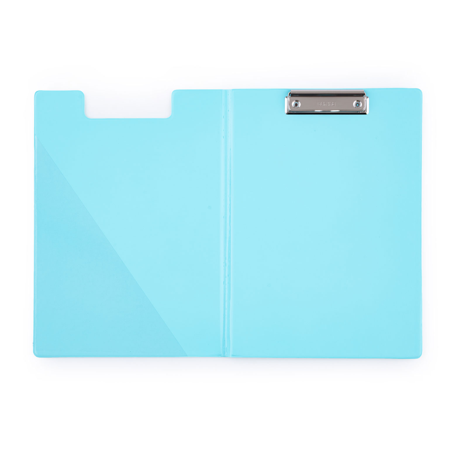 Uzavíratelná psací podložka s kovovým klipem, vyrobena z extra pevné lepenky. Vnitřní průhledná kapsa. Moderní pastelové barvy.