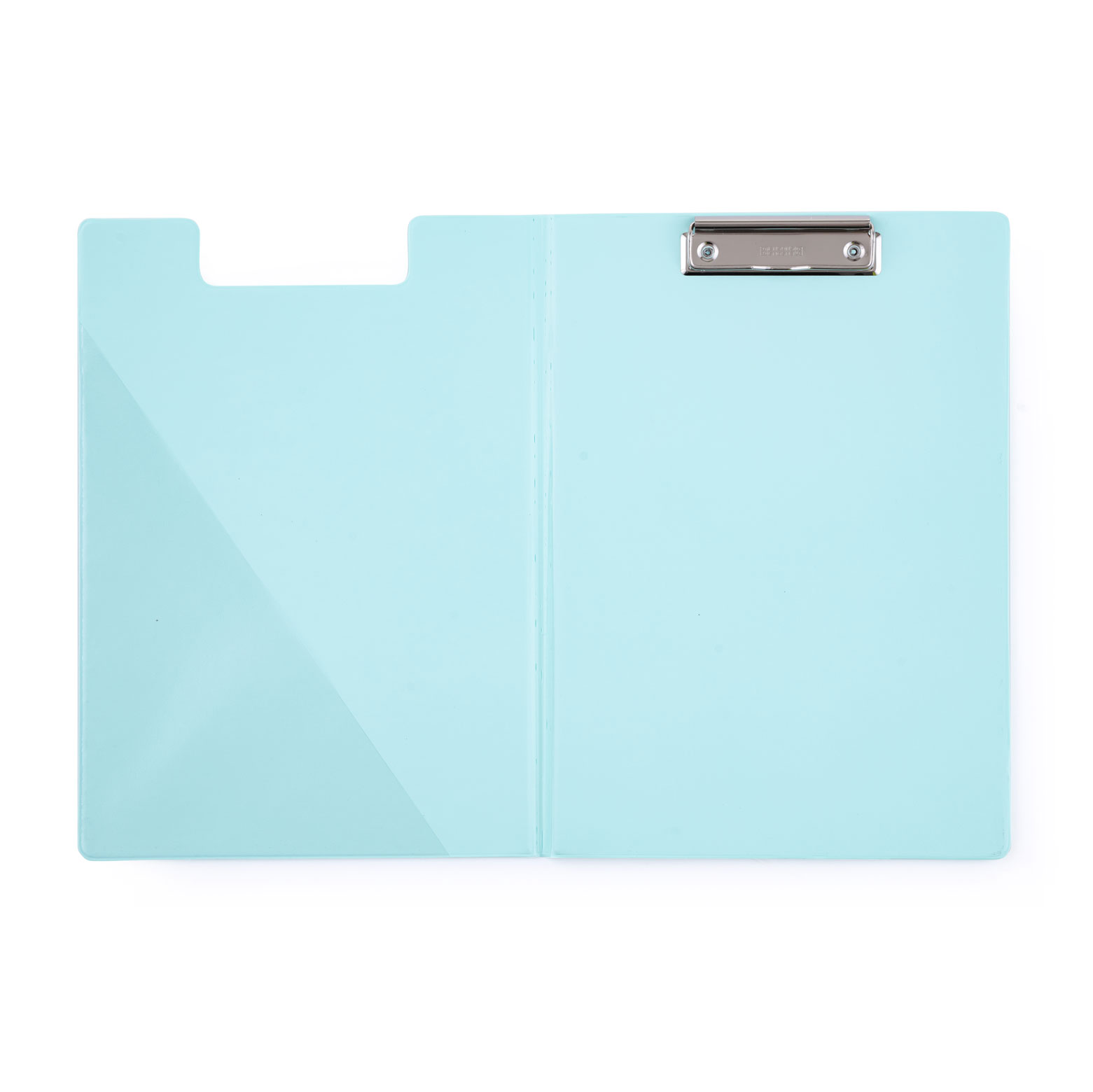 Uzavíratelná psací podložka s kovovým klipem, vyrobena z extra pevné lepenky. Vnitřní průhledná kapsa. Moderní pastelové barvy.