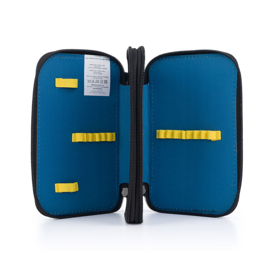 Školní penál dvoupatrový bez náplně s motivem vlka. Penál obsahuje 25 gumových poutek pro uložení všech psacích potřeba a drobností potřebných k výuce. Penál má pevný zip s velkými taháčky pro snadnou manipulaci. Jedno patro je opatřeno průhlednou přihrádkou pro týdenní rozvrh.