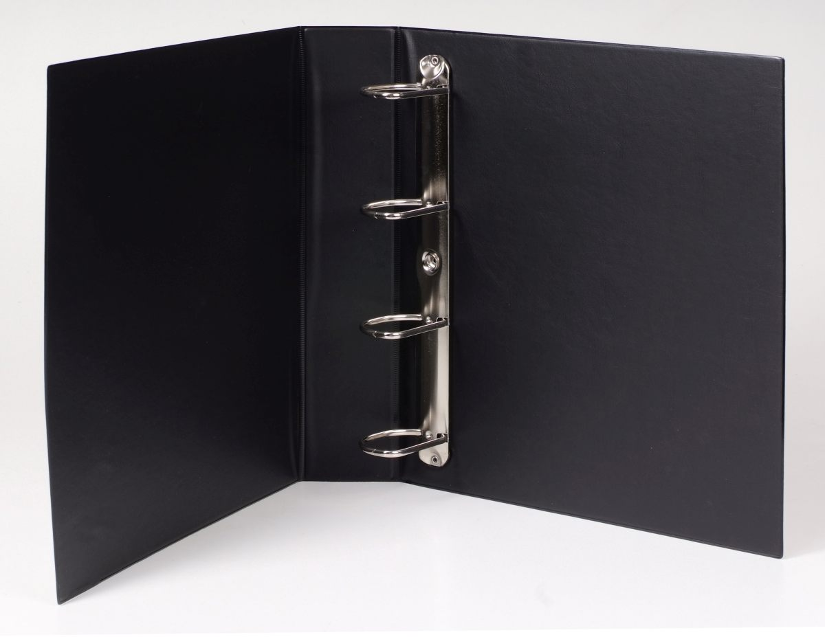Zakládací pořadač s průhlednou kapsou na přední straně a hřbetu. 4 kroužková mechanika, kroužek má tvar písmene "D"