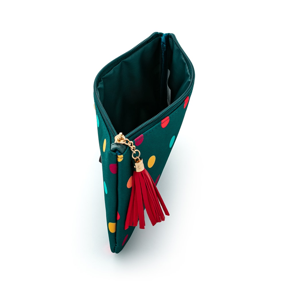 Kosmetická taška v puntíkovém provedení, zapínání na zip. Vhodná k uskladnění drobností v kabelce.