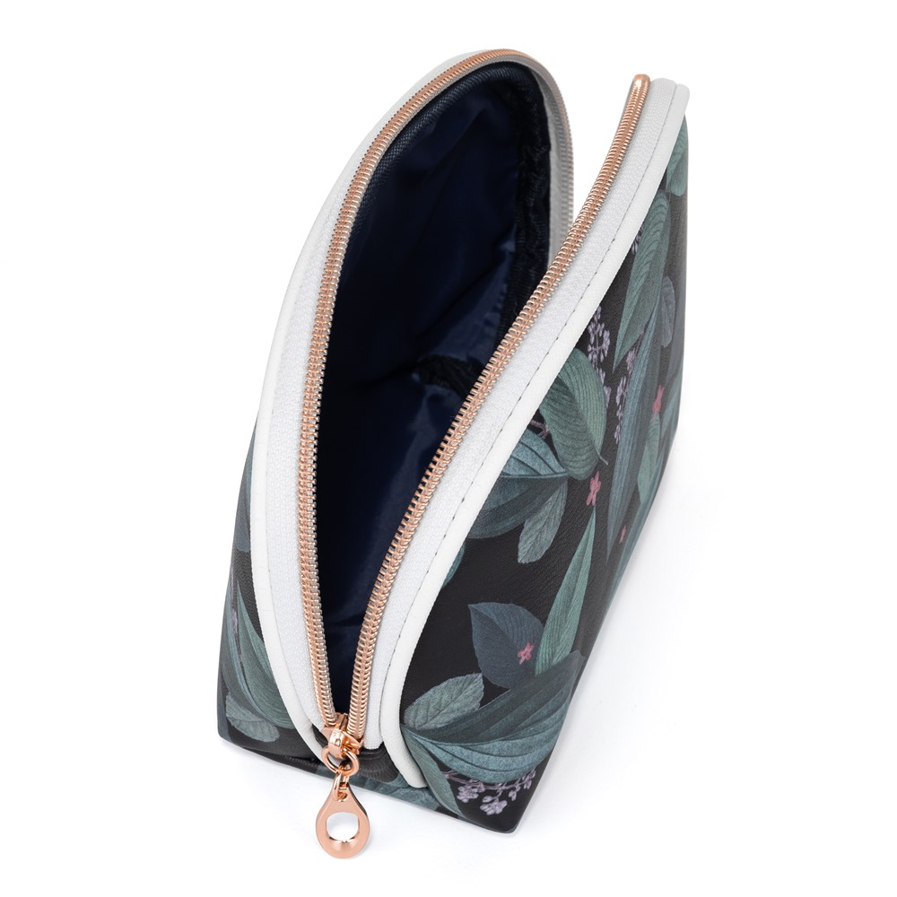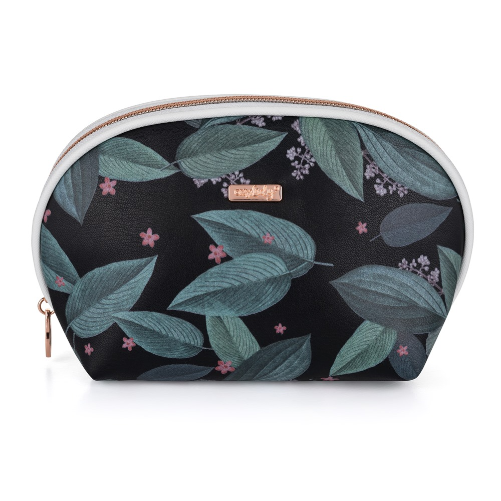 Cestovní kulatá kosmetická taška v tmavém provedení. Vhodná k uskladnění toaletních a kosmetických potřeb menší velikosti.