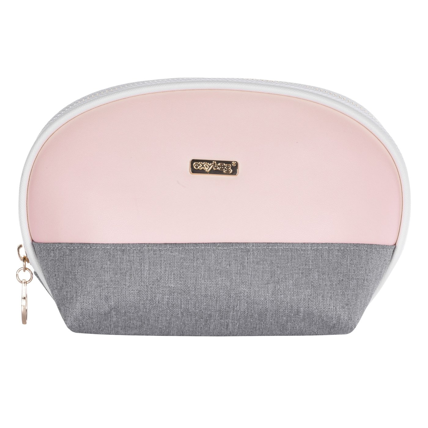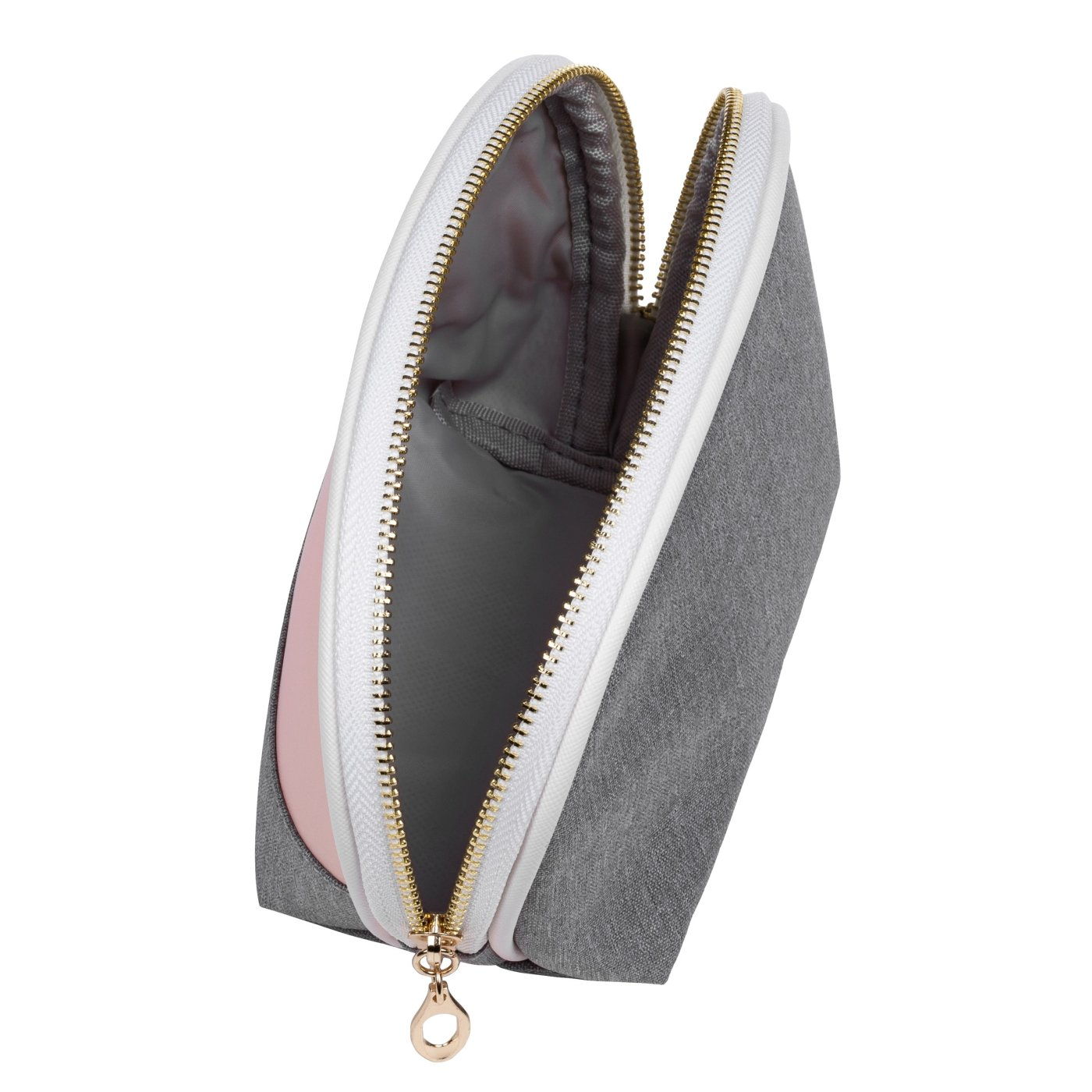 Cestovní kulatá kosmetická taška v šedorůžovém provedení. Vhodná k uskladnění toaletních a kosmetických potřeb menší velikosti.