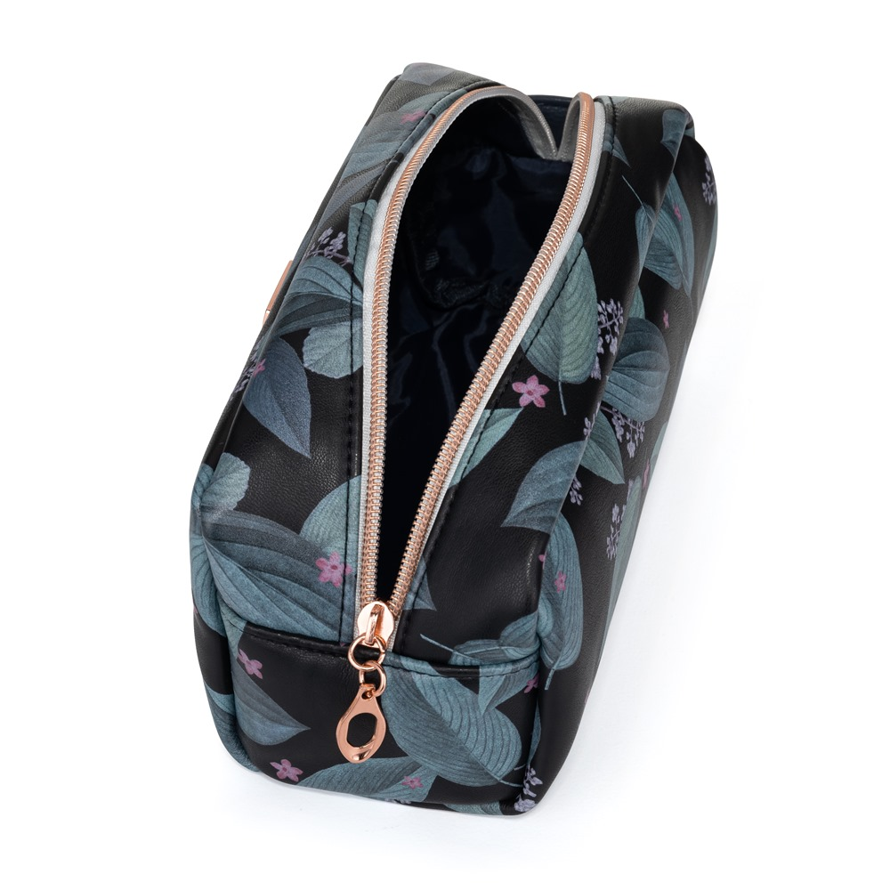 Menší cestovní kosmetická taška v tmavém provedení. Vhodná k uskladnění drobných toaletních a kosmetických potřeb.