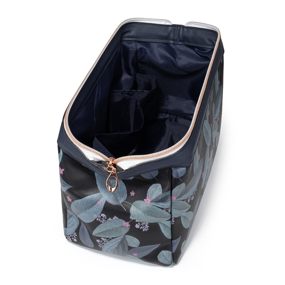 Větší cestovní kosmetická taška v tmavém provedení. Vhodná k uskladnění toaletních a kosmetických potřeb.