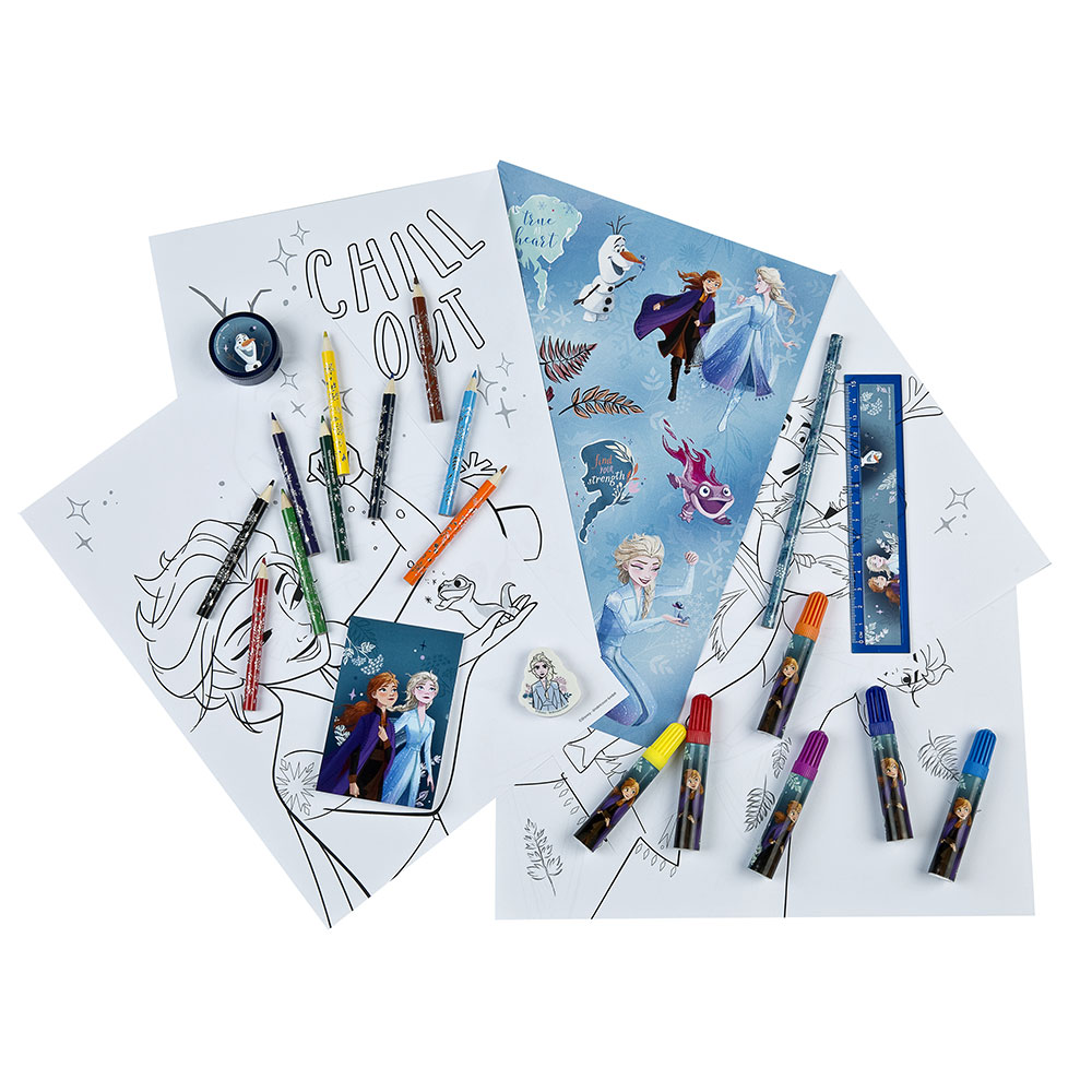 Kreativní sada s motivem Frozen obsahuje 10 mini barevných tužek, 6 fixů, tužku, pravítko, gumu, ořezávátko, poznámkový blok, 4 plakáty a 10 nálepek.