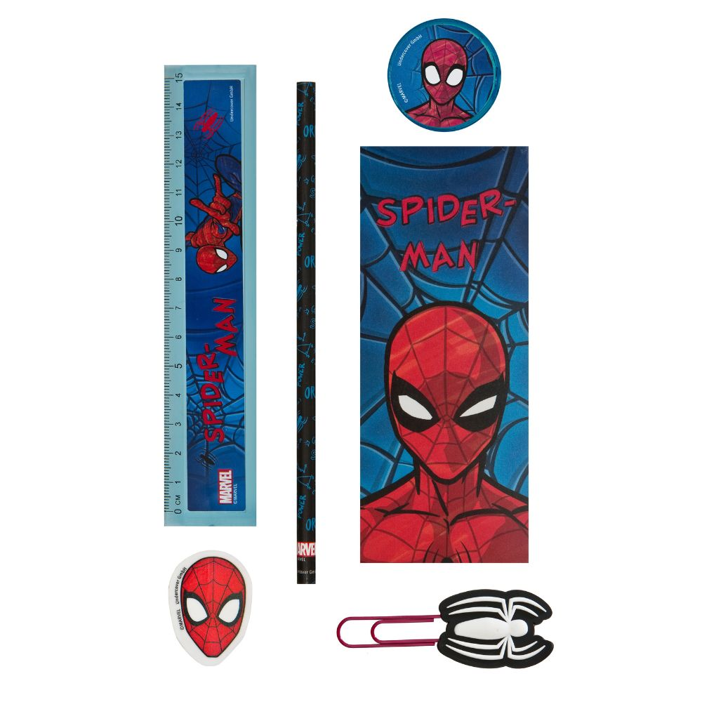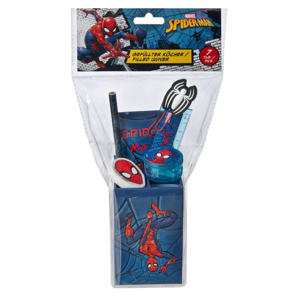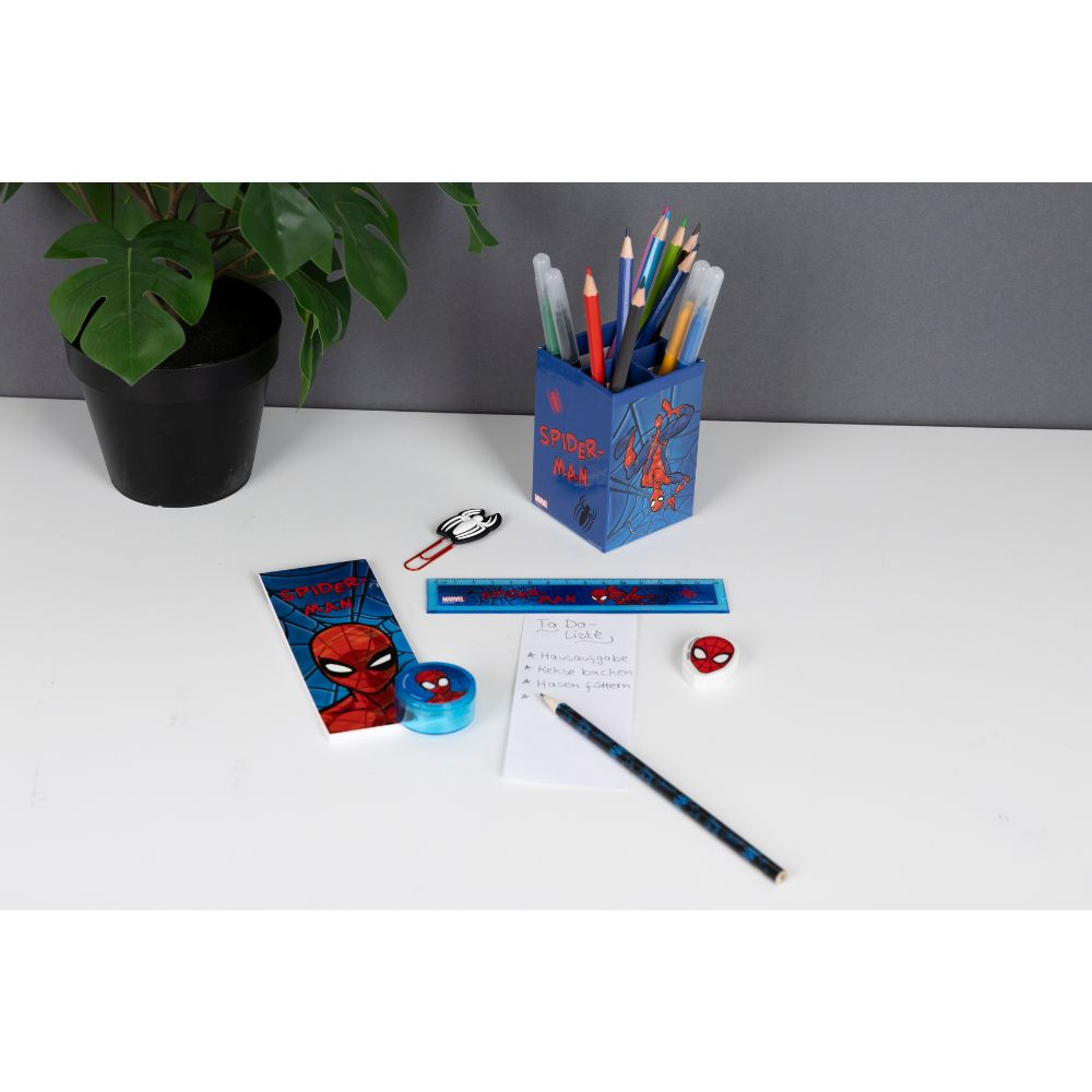 Kelímek s psacími potřebami s motivem Spider-Man. Sada obsahuje: kelímek, kancelářskou sponku, tužku, gumu, pravítko, ořezávátko, mini zápisník. Nevhodné pro děti mladší 3 let.