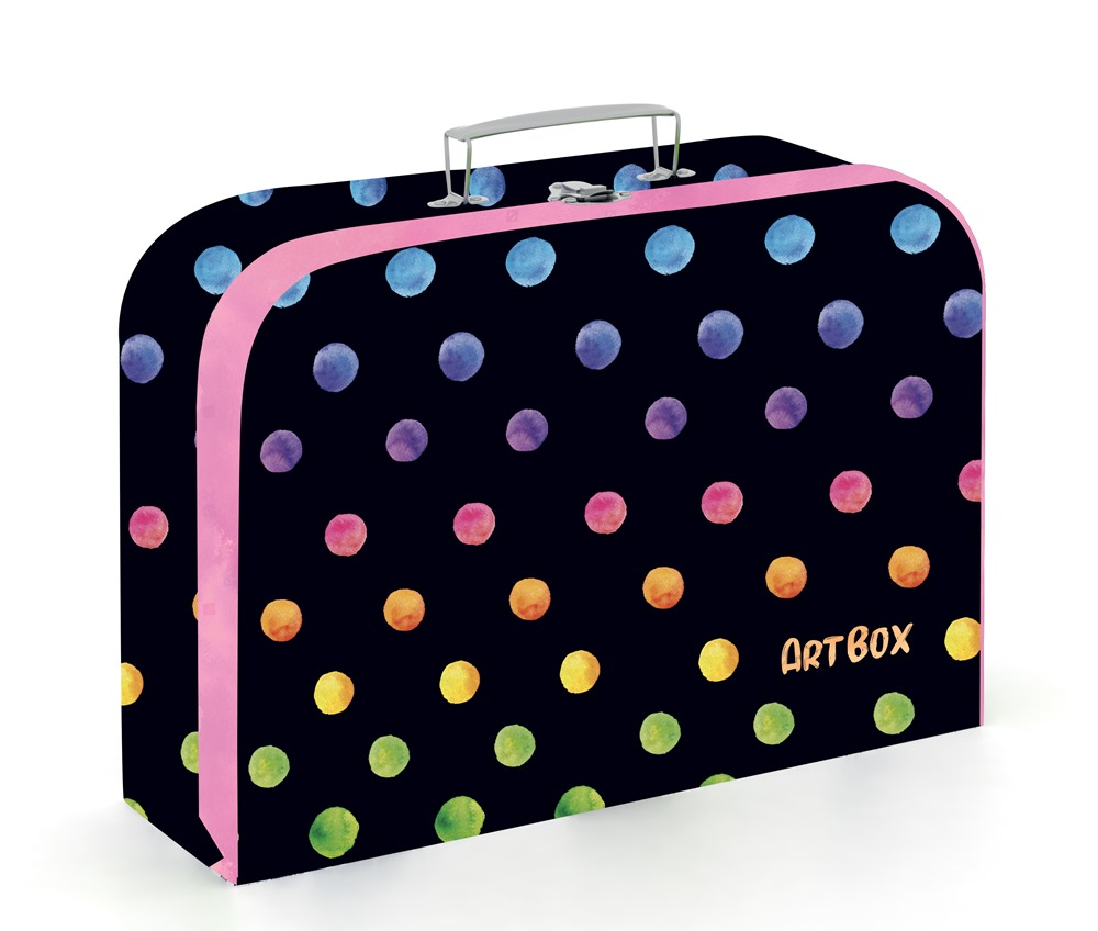 Lamino kufřík na výtvarnou výchovu s motivem barevných puntíků. Do kufříku se vejde formát A4.