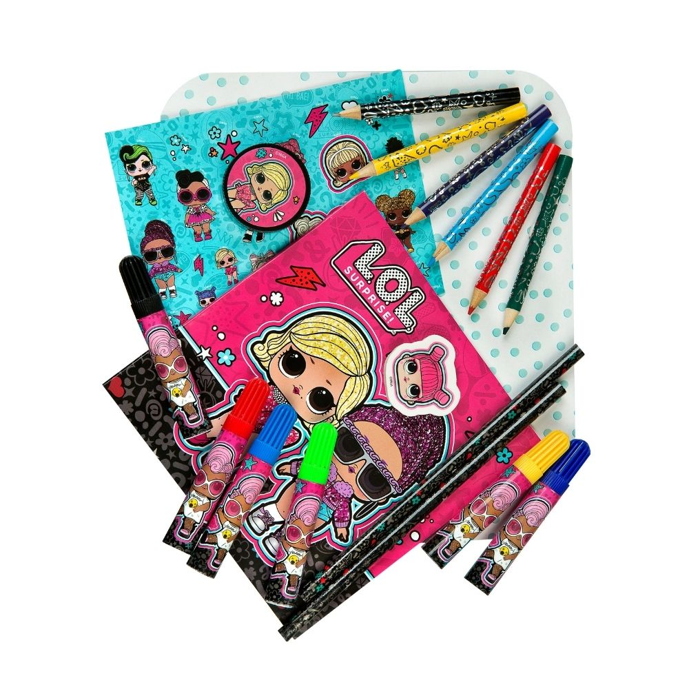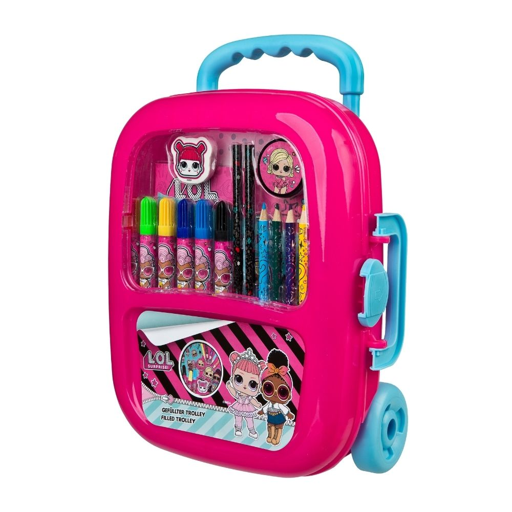 Dětský plastový kufřík na kolečkách s výtvarnými potřebami s motivem LOL surprise. Sada obsahuje 6 fixů, 6 pastelek, 2 nůžky, gumu, ořezávátko, list se samolepkami a omalovánky.