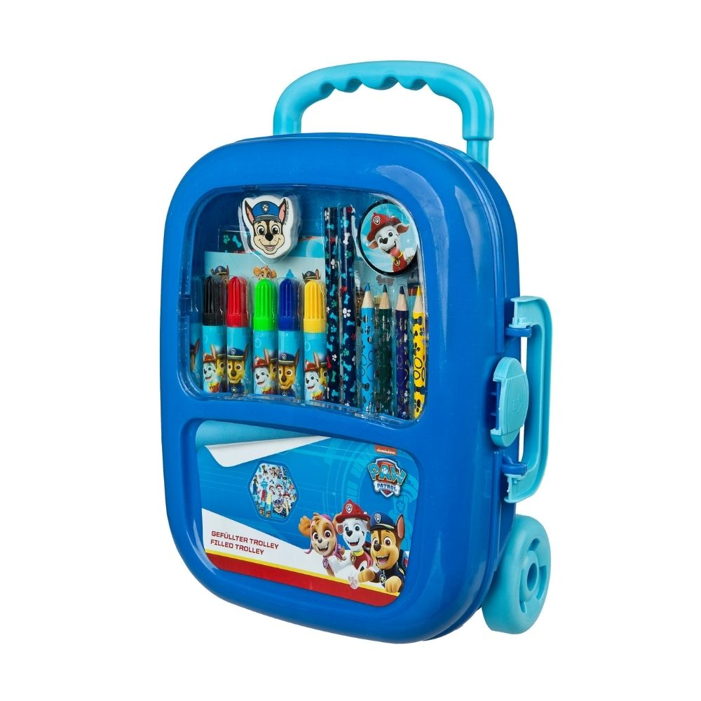 Dětský plastový kufřík na kolečkách s výtvarnými potřebami s motivem Paw Patrol. Sada obsahuje 6 fixů, 6 pastelek, 2 nůžky, gumu, ořezávátko, list se samolepkami a omalovánky.