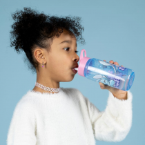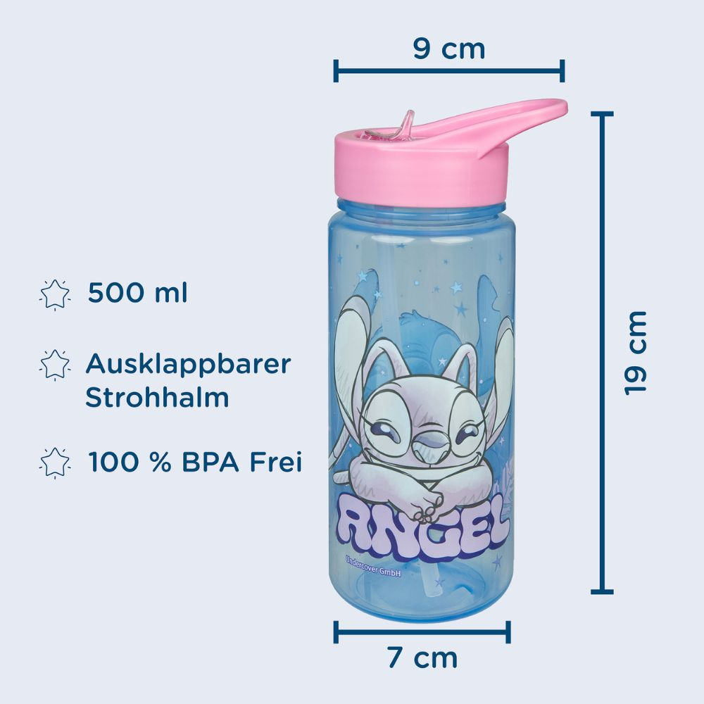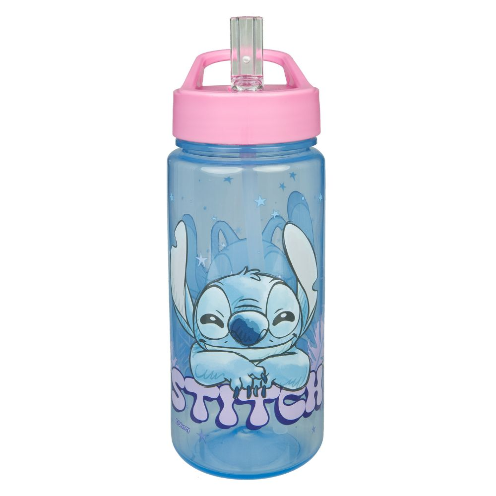 Plastová láhev na pití s motivem Stitch s integrovaným brčkem a odklápěcím pítkem. Láhev je vyrobena z kvalitního, zdravotně nezávadného materiálu.