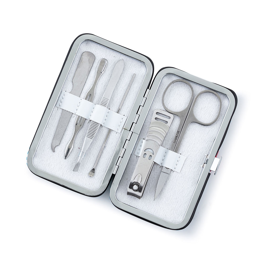 Cestovní manikúrní set 6 ks. Stříbrná sada obsahuje nůžky, kleštičky na nehty, zkosenou pinzetu, pilník, manikúrní tyčinku a zatlačovač kůžičky. Ideální velikost do kabelky či na cesty. Rozměry: 11 x 6,5 x 1,5 cm