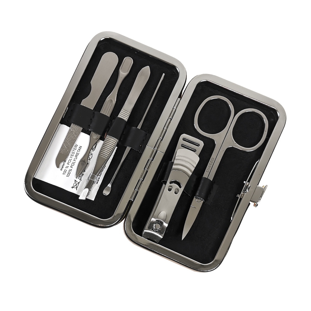 Cestovní manikúrní set 6 ks. Stříbrná sada obsahuje nůžky, kleštičky na nehty, zkosenou pinzetu, pilník, manikúrní tyčinku a zatlačovač kůžičky. Ideální velikost do kabelky či na cesty. Rozměry: 11 x 6,5 x 1,5 cm