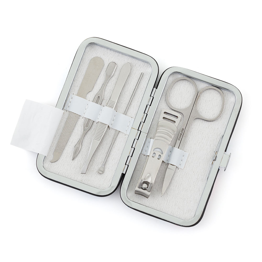 Cestovní manikúrní set 6 ks. Stříbrná sada obsahuje nůžky, kleštičky na nehty, zkosenou pinzetu, pilník, manikúrní tyčinku a zatlačovač kůžičky. Ideální velikost do kabelky či na cesty. Rozměry: 11 x 6,5 x 1,5 cm