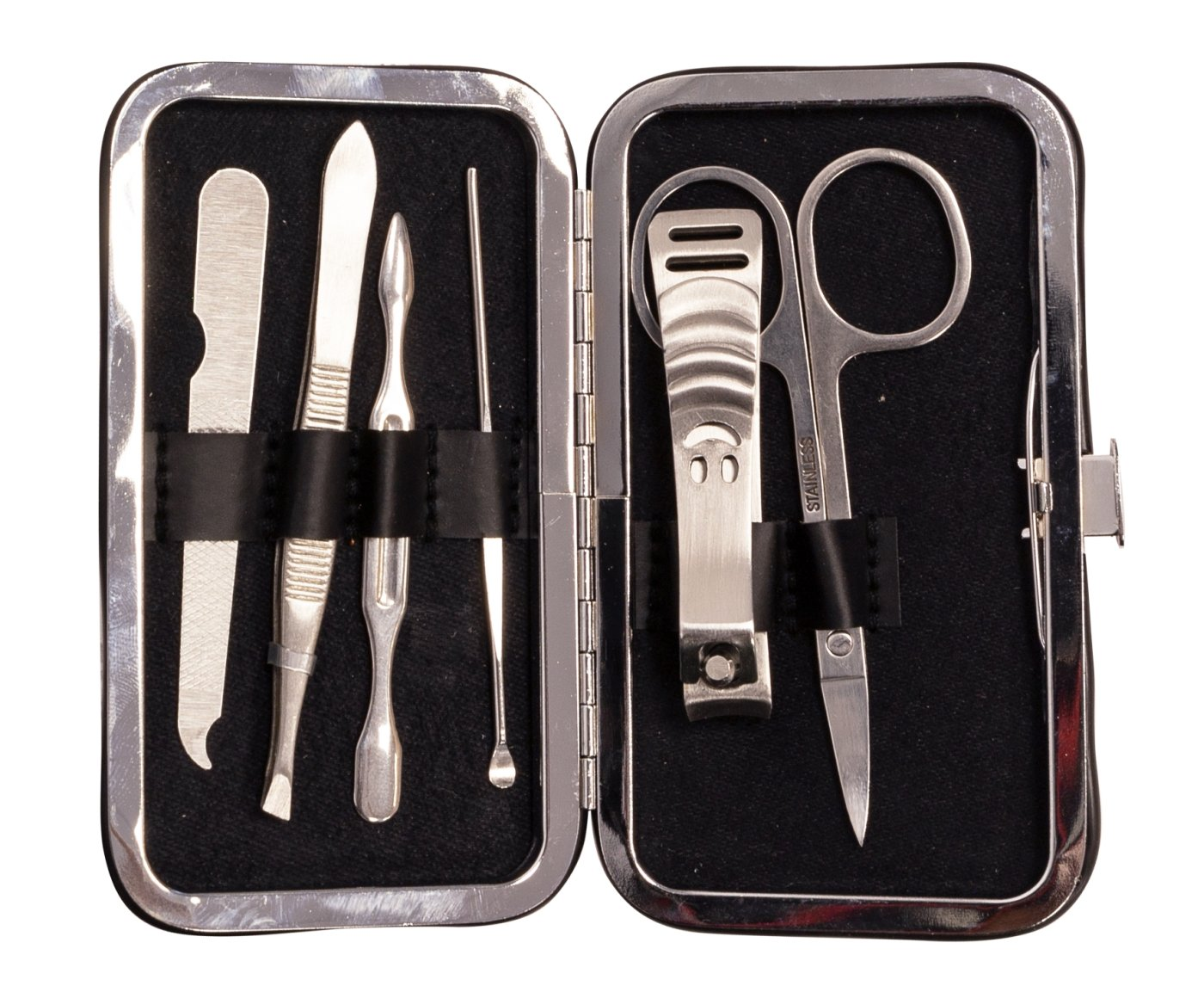Cestovní manikúrní set 6 ks ve světlém provedení. Stříbrná sada obsahuje nůžky, kleštičky na nehty, zkosenou pinzetu, pilník, manikúrní tyčinku a zatlačovač kůžičky. Ideální velikost do kabelky či na cesty.