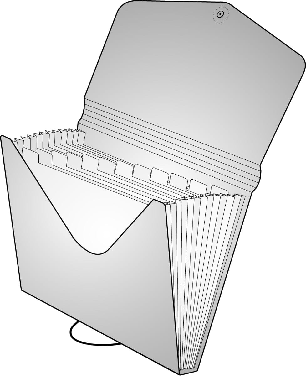 Organizér dokumentů A4, 13 vnitřních přihrádek, včetně popisků. Roztažitelná horní část. Uzavírání pomocí gumičky a knoflíku. Extra silný materiál PP, obal 700/vnitřní kapsy 140mic