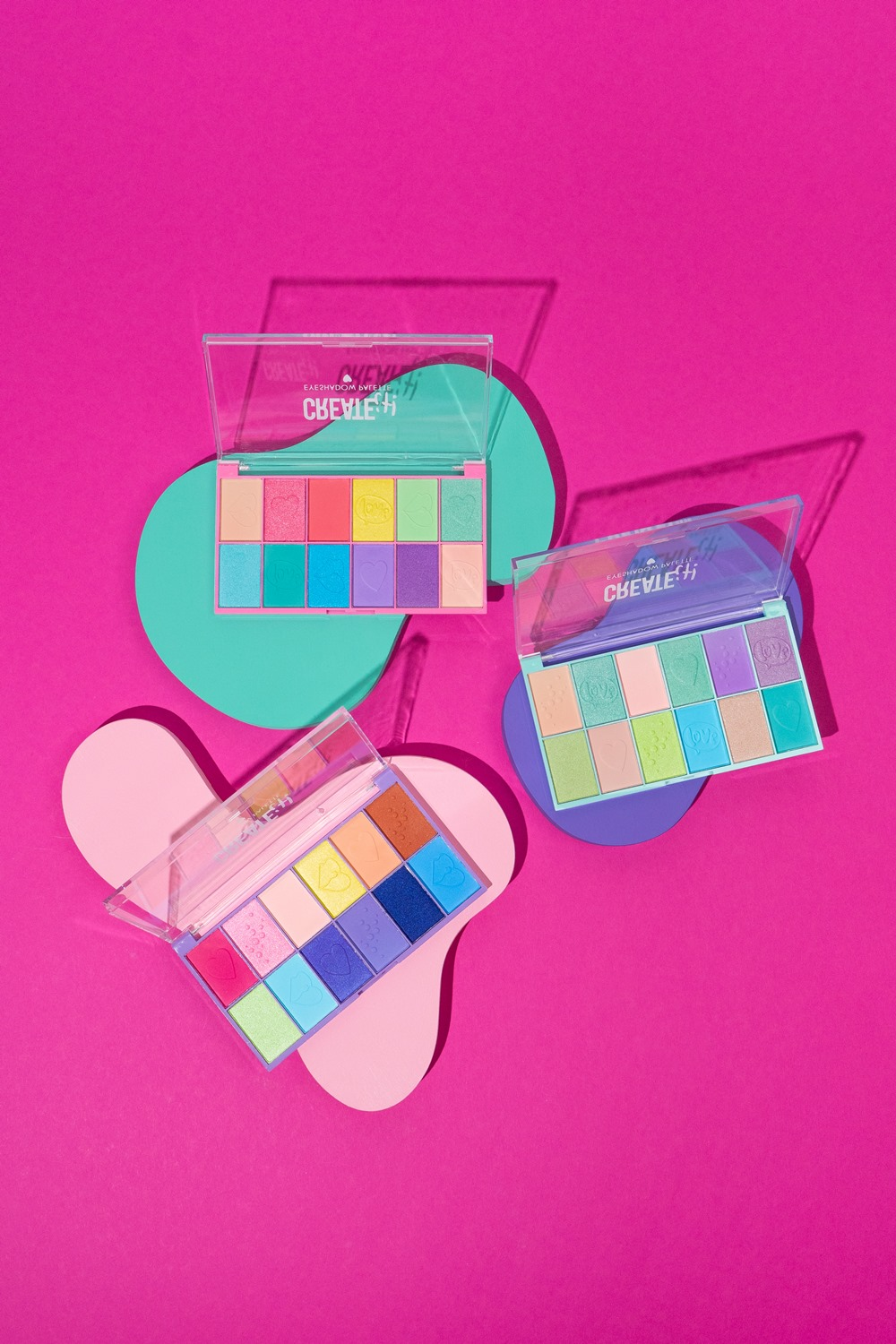 Sbohem nudným očním stínům! Paletka očních stínů od Create it! nabízí ty nejjasnější barvy, které promění tvé oči v malou duhovou paletu nebo ti umožní držet se jen jednoho odstínu. K dispozici jsou 3 různé paletky, z nichž každá obsahuje 12 barevných stínů s originálním vzorem, takže můžeš nasbírat dohromady 36 odstínů!Užij si líčení s kamarádkami a začni svou kariéru malého make-up artisty. Paletky jsou dostupné v barvách růžová, fialová a zelená. Produkty Create it! jsou dermatologicky testované, bez parabenů a nejsou testované na zvířatech, vhodné pro dívky ve věku 6–14 let.