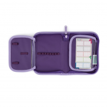Jednopatrový školní penál s 2 chlopněmi, prázdný obsahuje 25 gumových poutek pro uchycení psacích potřeb. Na vnitřních chlopních jsou průhledné fólie pro rozvrh hodin.