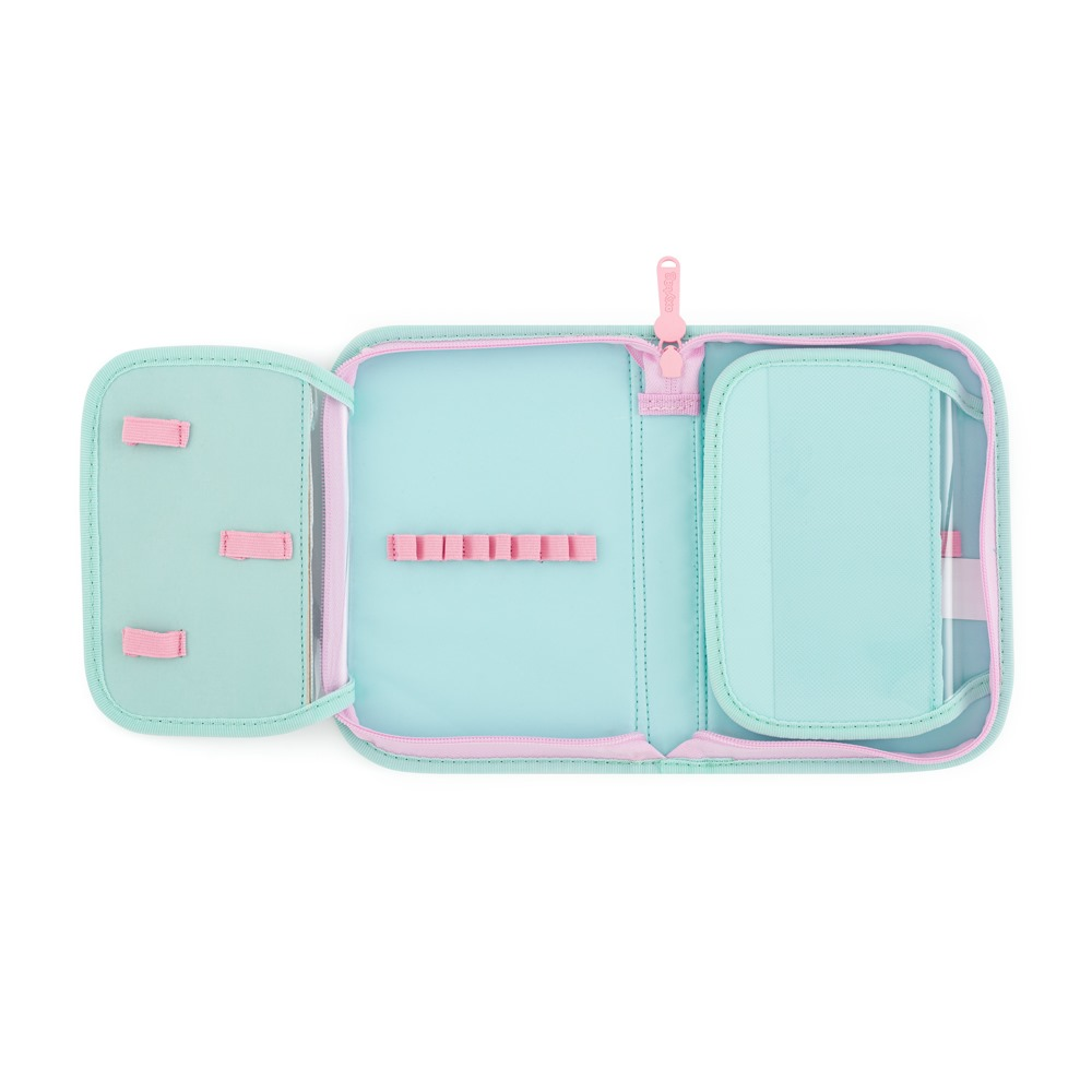 Jednopatrový školní penál s 2 chlopněmi, prázdný obsahuje 25 gumových poutek pro uchycení psacích potřeb. Na vnitřních chlopních jsou průhledné fólie pro rozvrh hodin.