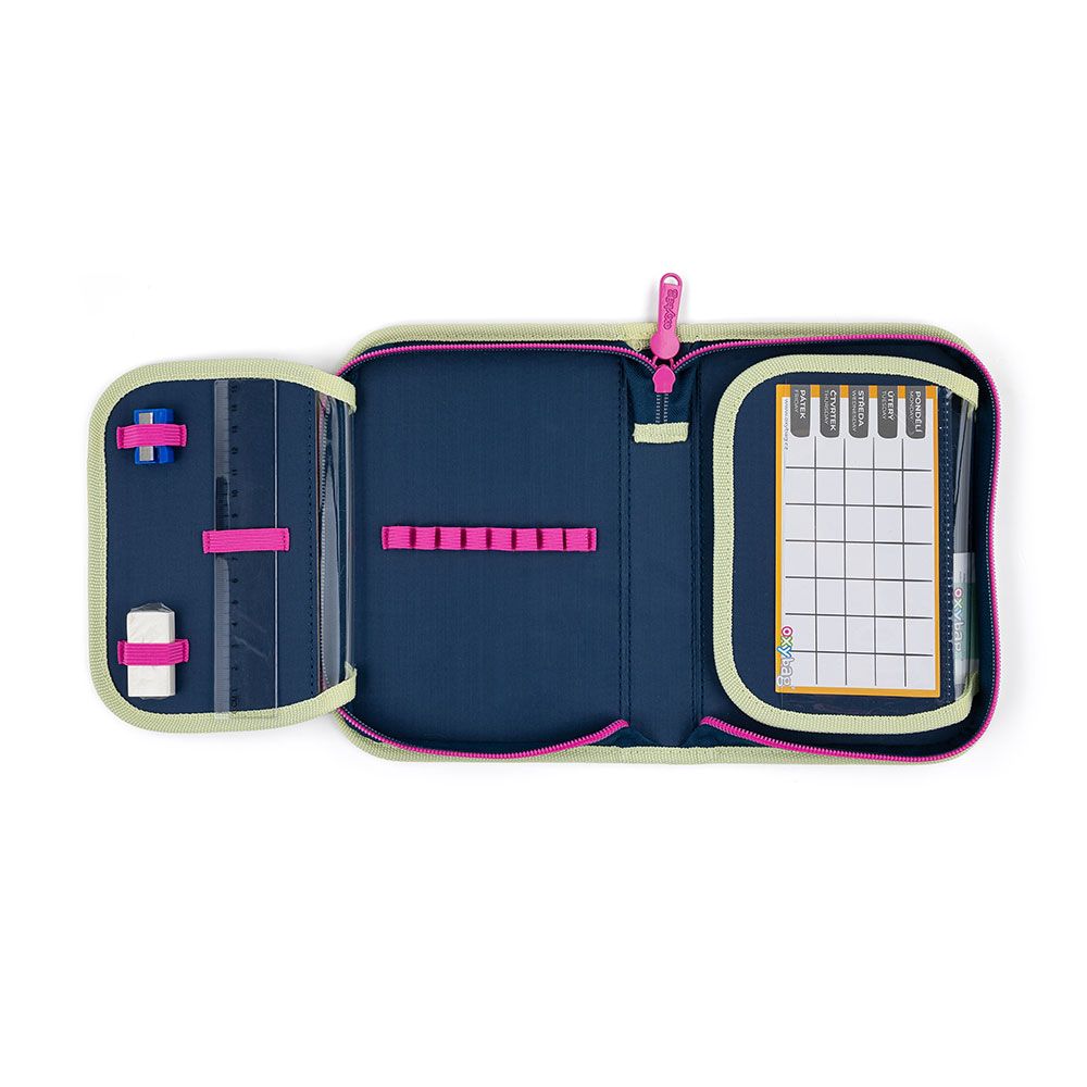 Jednopatrový školní penál s 2 chlopněmi, prázdný obsahuje 25 gumových poutek pro uchycení psacích potřeb. Na vnitřních chlopních jsou průhledné fólie pro rozvrh hodin.