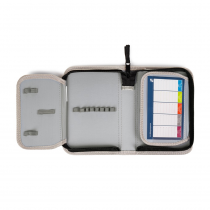 Jednopatrový školní penál se 2 chlopněmi, prázdný obsahuje 25 gumových poutek pro uchycení psacích potřeb. Na vnitřních chlopních jsou průhledné fólie pro rozvrh hodin.