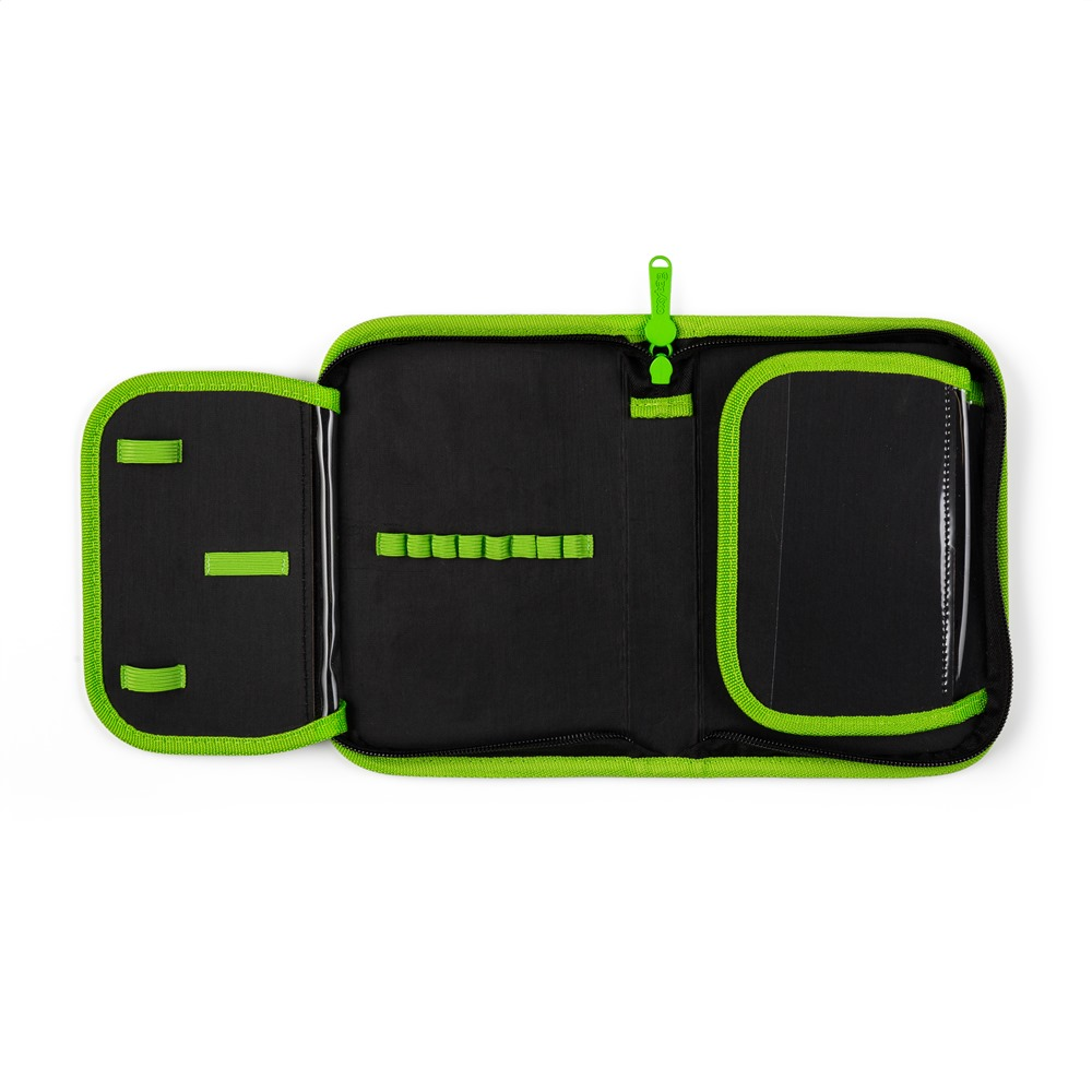 Jednopatrový školní penál s 2 chlopněmi, prázdný obsahuje 25 gumových poutek pro uchycení psacích potřeb. Na vnitřních chlopních jsou průhledné fólie pro rozvrh hodin.