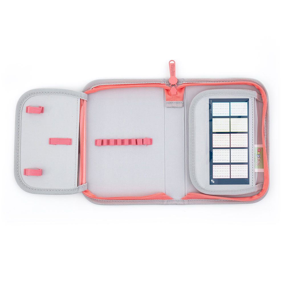 Jednopatrový školní penál s 2 chlopněmi, prázdný obsahuje 25 gumových poutek pro uchycení psacích potřeb. Na vnitřních chlopních jsou průhledné fólie pro rozvrh hodin.