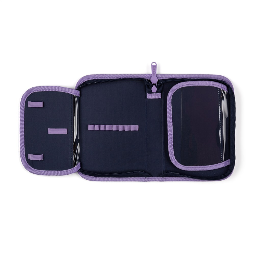 Jednopatrový školní penál s 2 chlopněmi, prázdný obsahuje 25 gumových poutek pro uchycení psacích potřeb. Na vnitřních chlopních jsou průhledné fólie pro rozvrh hodin.