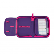 Jednopatrový školní penál s 2 chlopněmi, prázdný obsahuje 25 gumových poutek pro uchycení psacích potřeb. Na vnitřních chlopních jsou průhledné fólie pro rozvrh hodin.