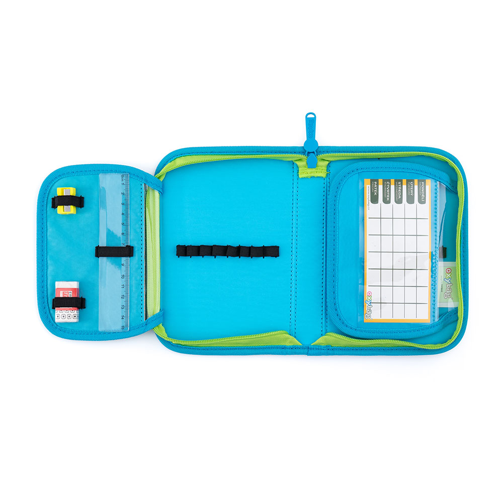 Jednopatrový školní penál s 2 chlopněmi, prázdný obsahuje 25 gumových poutek pro uchycení psacích potřeb. Na vnitřních chlopních jsou průhledné fólie pro rozvrh hodin.