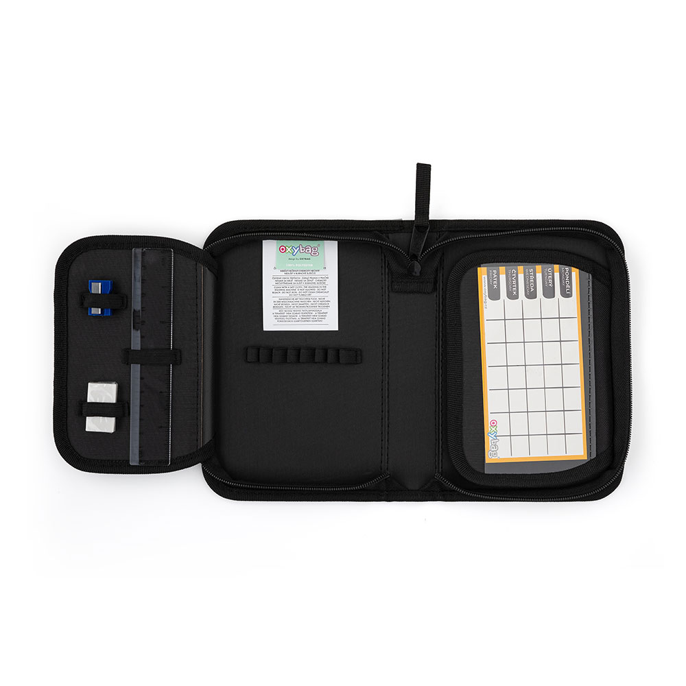 Jednopatrový školní penál s 2 chlopněmi řady UNICOLOR, prázdný, obsahuje 25 gumových poutek pro uchycení psacích potřeb. Na vnitřních chlopních jsou průhledné fólie pro rozvrh hodin.