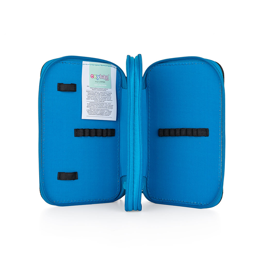 Školní penál dvoupatrový bez náplně. Penál obsahuje 25 gumových poutek pro uložení všech psacích potřeba a drobností potřebných k výuce. Penál má pevný zip s velkými taháčky pro snadnou manipulaci. Jedno patro je opatřeno průhlednou přihrádkou pro týdenní rozvrh.