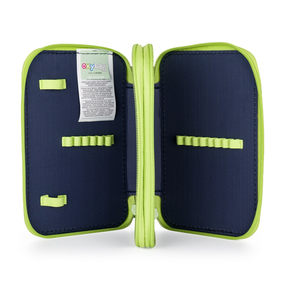 Školní penál dvoupatrový bez náplně. Penál obsahuje 25 gumových poutek pro uložení všech psacích potřeba a drobností potřebných k výuce. Penál má pevný zip s velkými taháčky pro snadnou manipulaci. Jedno patro je opatřeno průhlednou přihrádkou pro týdenní rozvrh.