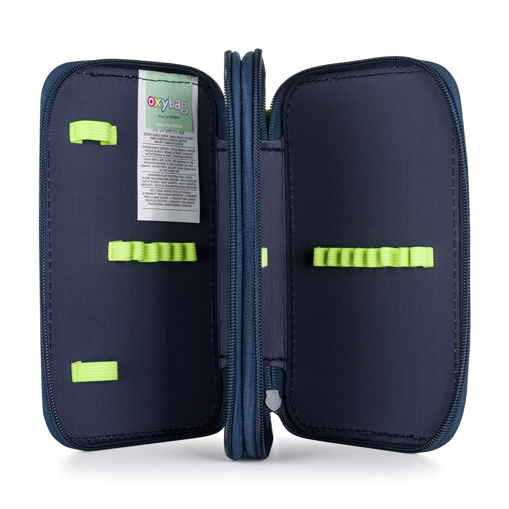 Školní penál dvoupatrový bez náplně. Penál obsahuje 25 gumových poutek pro uložení všech psacích potřeba a drobností potřebných k výuce. Penál má pevný zip s velkými taháčky pro snadnou manipulaci. Jedno patro je opatřeno průhlednou přihrádkou pro týdenní rozvrh.
