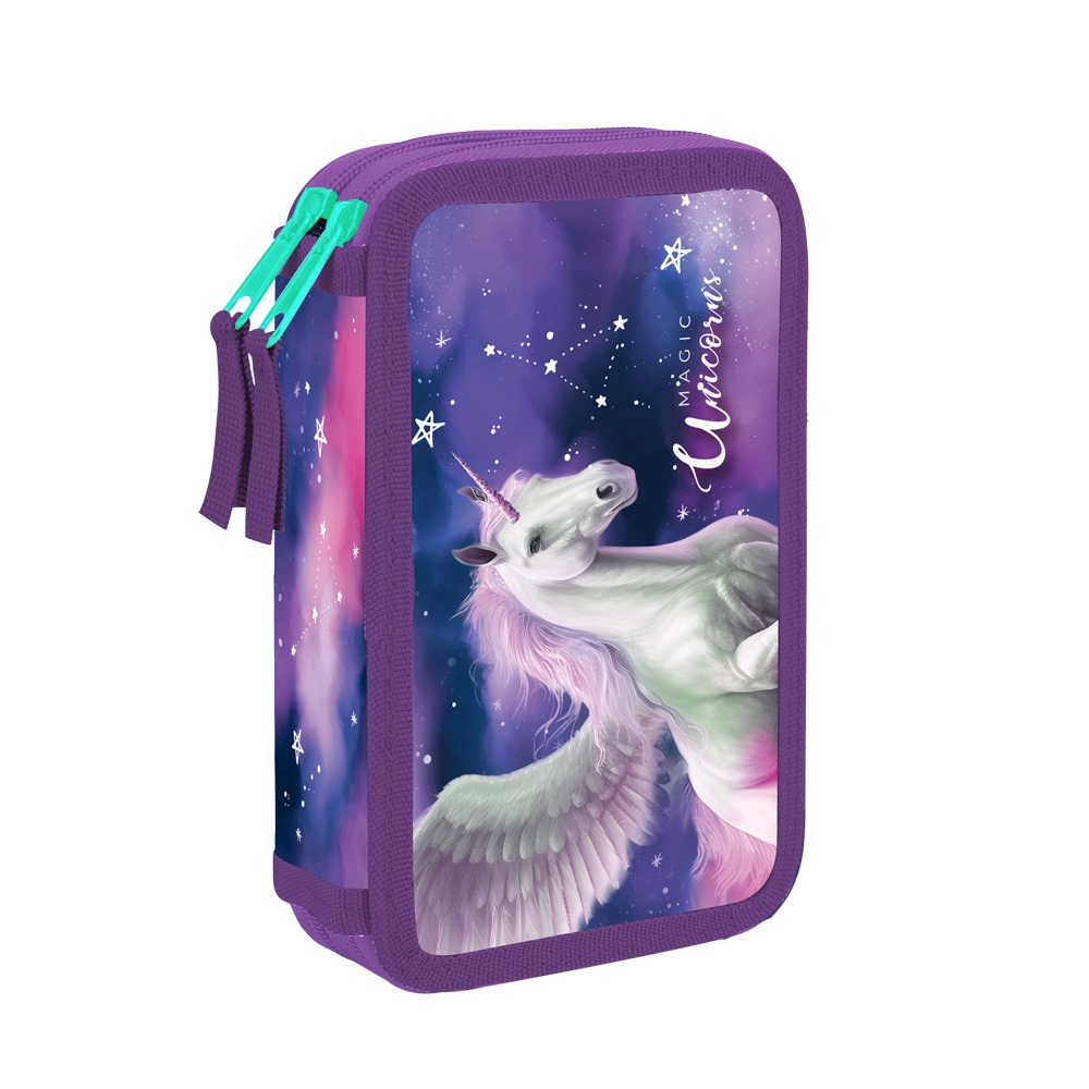 Školní penál dvoupatrový bez náplně. Penál obsahuje 25 gumových poutek pro uložení všech psacích potřeba a drobností potřebných k výuce. Penál má pevný zip s velkými taháčky pro snadnou manipulaci. Jedno patro je opatřeno průhlednou přihrádkou pro týdenní rozvrh.