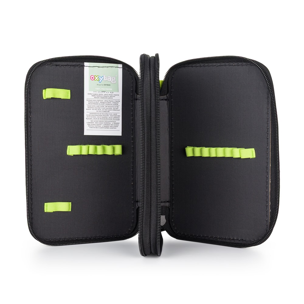 Školní penál dvoupatrový bez náplně. Penál obsahuje 25 gumových poutek pro uložení všech psacích potřeba a drobností potřebných k výuce. Penál má pevný zip s velkými taháčky pro snadnou manipulaci. Jedno patro je opatřeno průhlednou přihrádkou pro týdenní rozvrh.